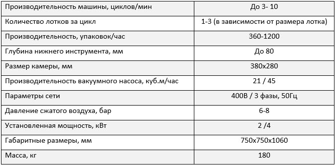 Оператор загружает лотки с продуктом в установочные места рабочего стола, затем активирует автоматический рабочий цикл: рабочий стол заходит под вакуумную камеру, в которой происходят вакуумирование, подача газомодифицированной среды и и запайка.